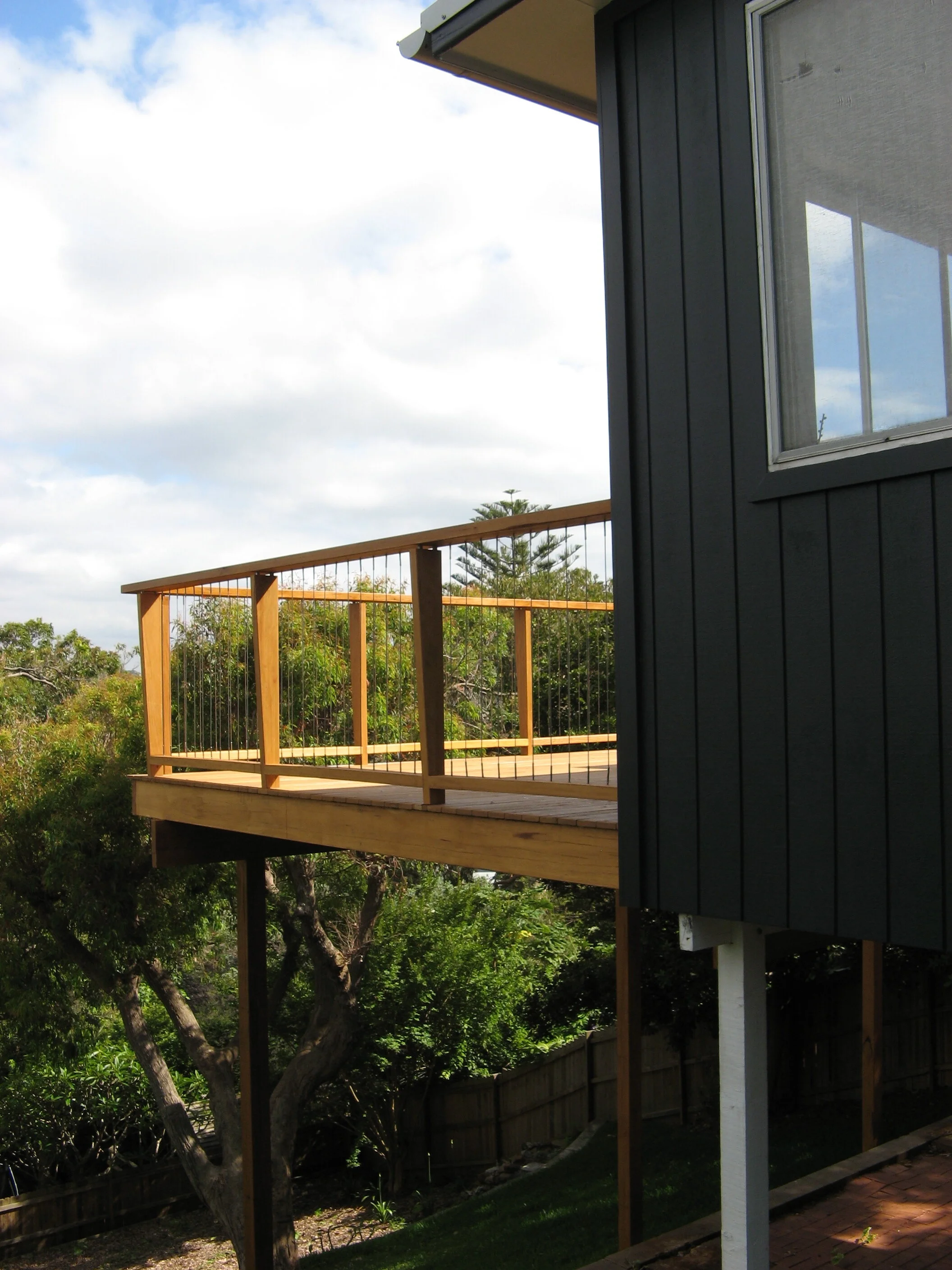 To take advantage of high ground views, a new first storey deck was added to this Avalon home. The deck is constructed completely of Black Butt timber with a vertical stainless steel wire balustrade.
