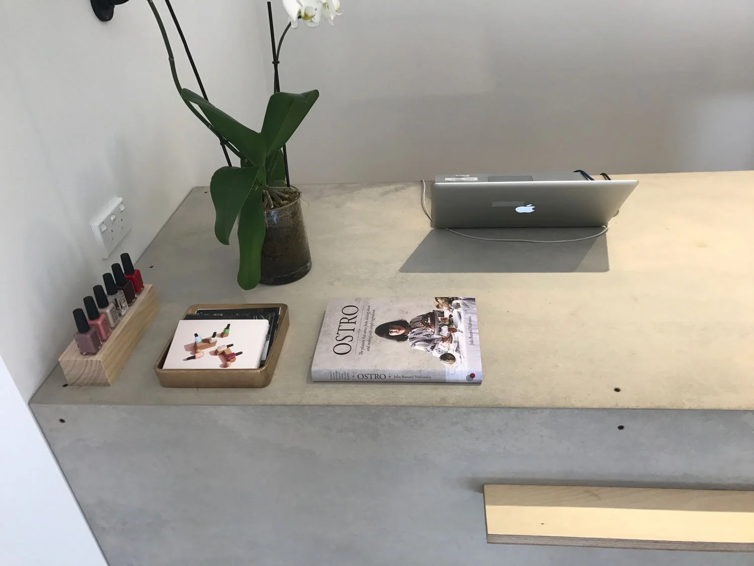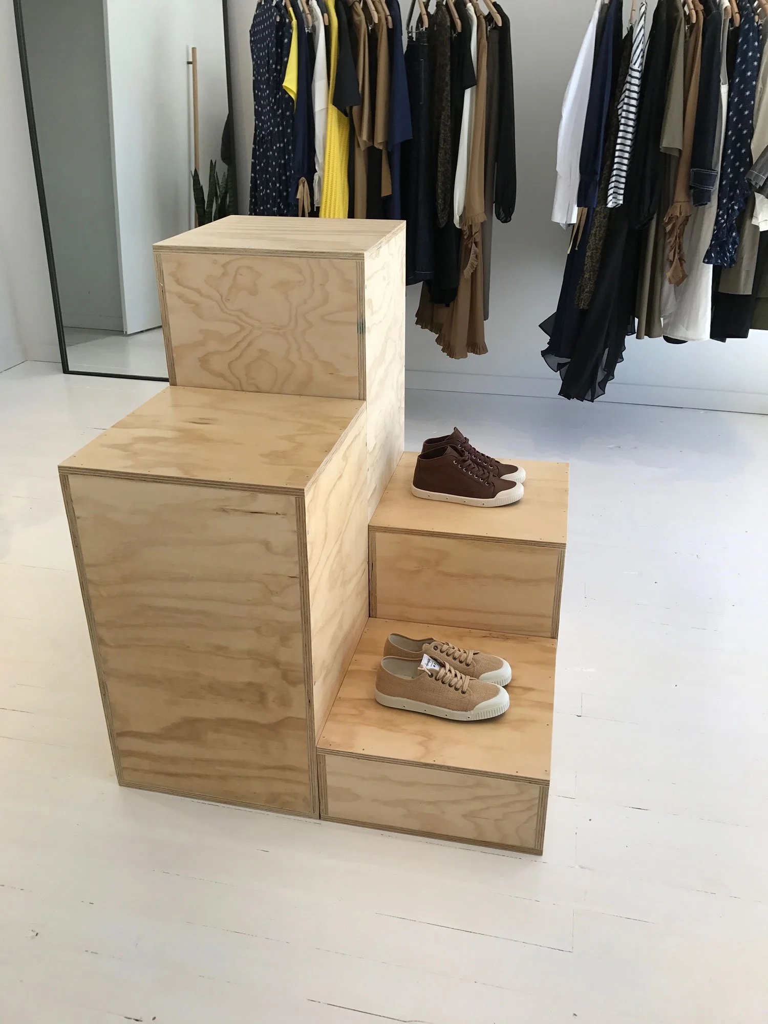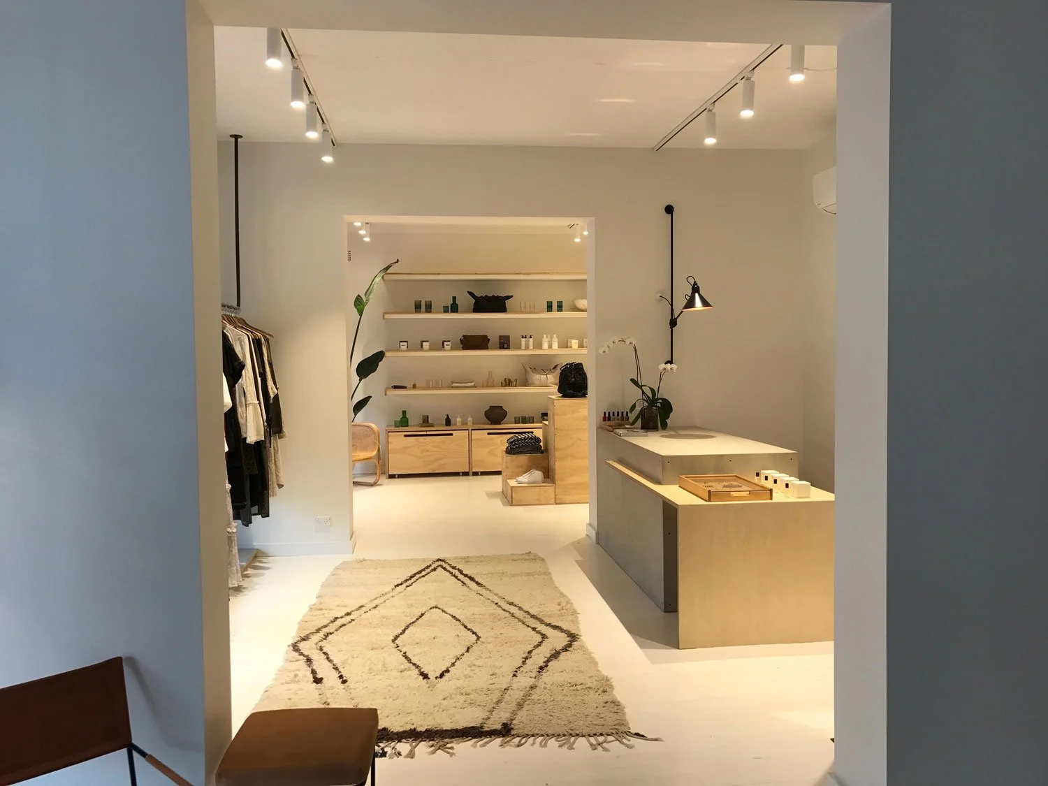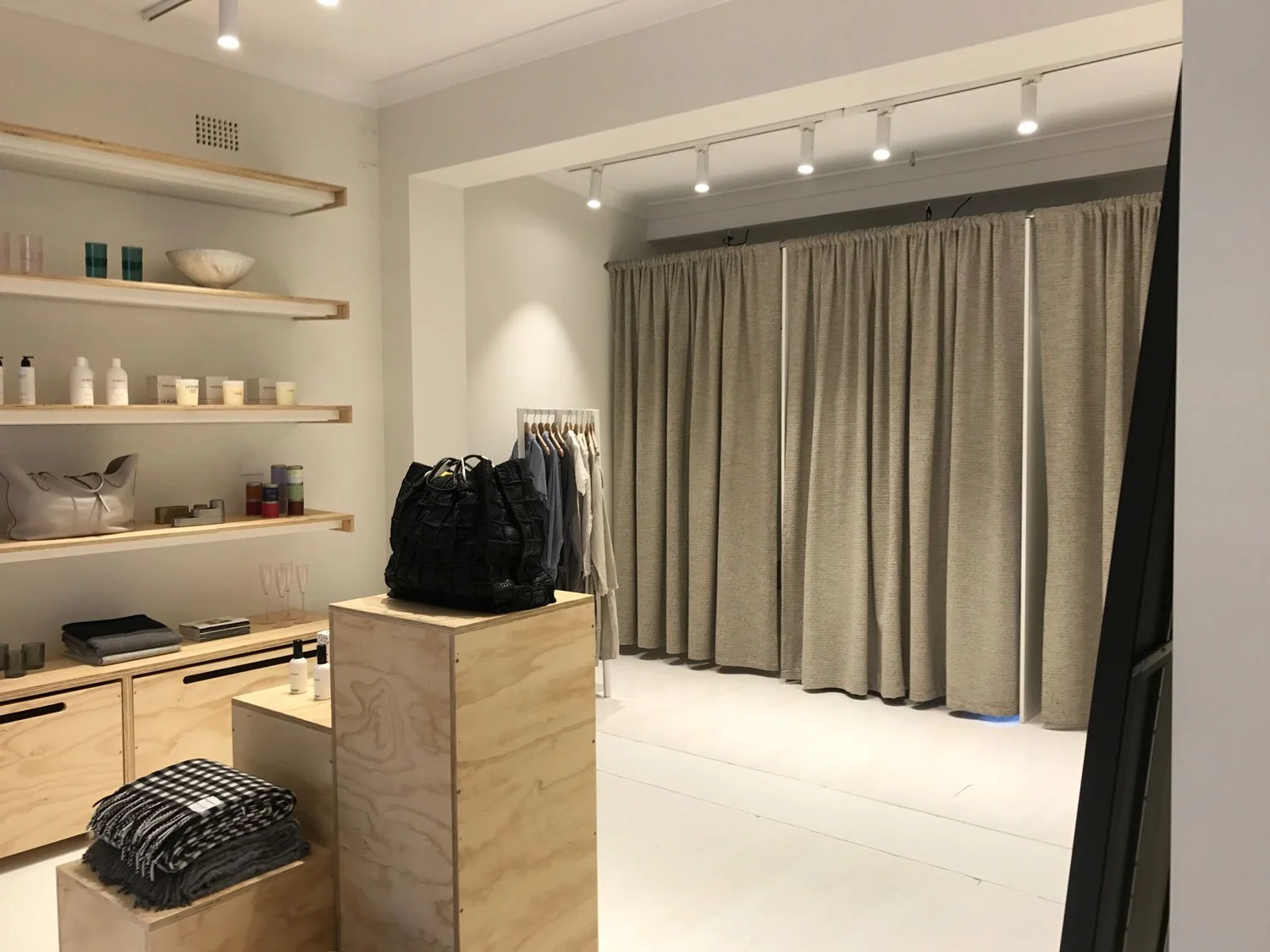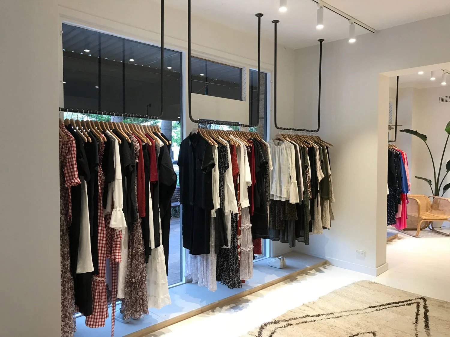 To create a clean white canvas all walls and openings were plaster boarded then painted white. The floorboards were also sanded and painted white. Custom details from Timber Artistry include a cement counter, plywood floating shelves and drawers, white barn door, steel hanging racks anchored to the ceiling, shop window display plinths and merchandising displays. Track lighting throughout the store was also installed to complete the look. Timber Artistry was able to source architectural plants from Dragon Trees Australia to complete the new store fit out.
